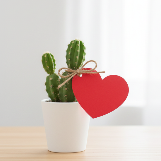 A tiny yet charming cactus placed in a white minimalist pot, decorated with a cute red heart tag. This adorable mini plant symbolizes lasting affection and resilience — a perfect small gift for expressing sweet and simple love.