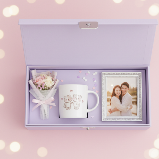 A charming lavender gift box featuring a mini rose bouquet, a cute bear mug, and a beautiful photo frame. A perfect gift for couples, friendships, and special memories.
