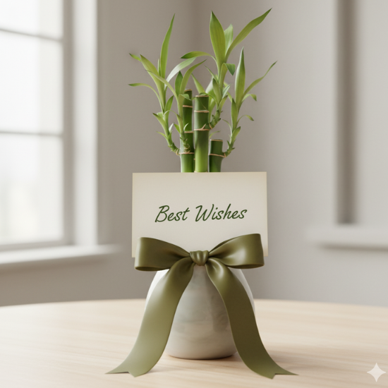 A fresh and elegant Lucky Bamboo plant placed in a smooth white ceramic pot, symbolizing prosperity, harmony, and good fortune. Paired with a “Best Wishes” tag, this plant makes an ideal gift for new beginnings, professional milestones, and positive energy at home or work.