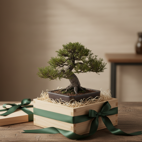 A beautifully curated Juniper Bonsai placed inside a premium wooden gift box, symbolizing peace, harmony, and longevity. Its lush green foliage brings timeless natural beauty to any space, making it a perfect gift for home or office décor. The elegant green ribbon adds a thoughtful finishing touch, giving the entire presentation a serene and luxurious feel.